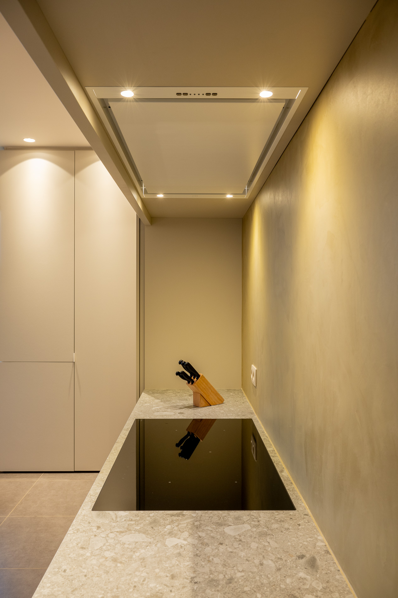 De Quooker-kraan voegt een moderne touch toe en zorgt voor een perfecte balans tussen functionaliteit en verfijning. Elk detail is zorgvuldig overwogen, van de ingewerkte koffiehoek tot de zachte kleurovergangen op de muren, gerealiseerd met een specifieke verftechniek die diepte en karakter toevoegt aan de ruimte.